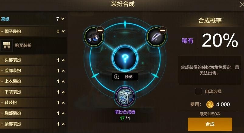 天空套的合成之旅: 合成天空套的材料相对明确:「2件高级时装+1个装扮合成器+4000金币」,成功的概率是20%,获取“高级时装”和“装扮合成器”是合成的关键,主要获取方式有两种: