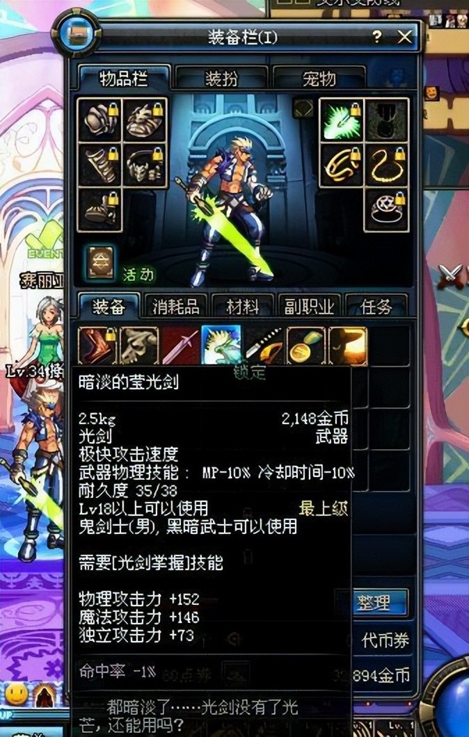 黯淡的荧光剑:这把剑是剑魂角色在18级转职时的必备装备,尽管它只是一件白色装备,但在当时光剑稀缺的情况下,它的珍贵程度极高。