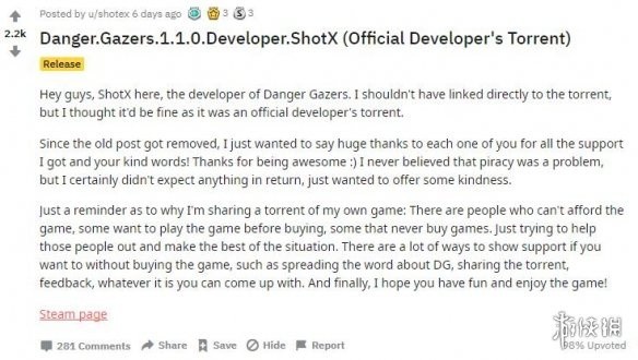 开发者ShotX表示,他发布破解版的初衷并不是为了另类打广告,而是考虑到部分玩家无法承担10美元的费用,或者想要先试玩再决定是否购买,他还考虑到一些玩家可能不喜欢购买游戏,他选择了发布破解版,希望为这些玩家提供体验游戏的机会,他强调,作为开发者,他唯一的请求是:如果玩家喜欢《危险凝视者》,并且还想体验更多独立游戏,请考虑支持并购买正版。