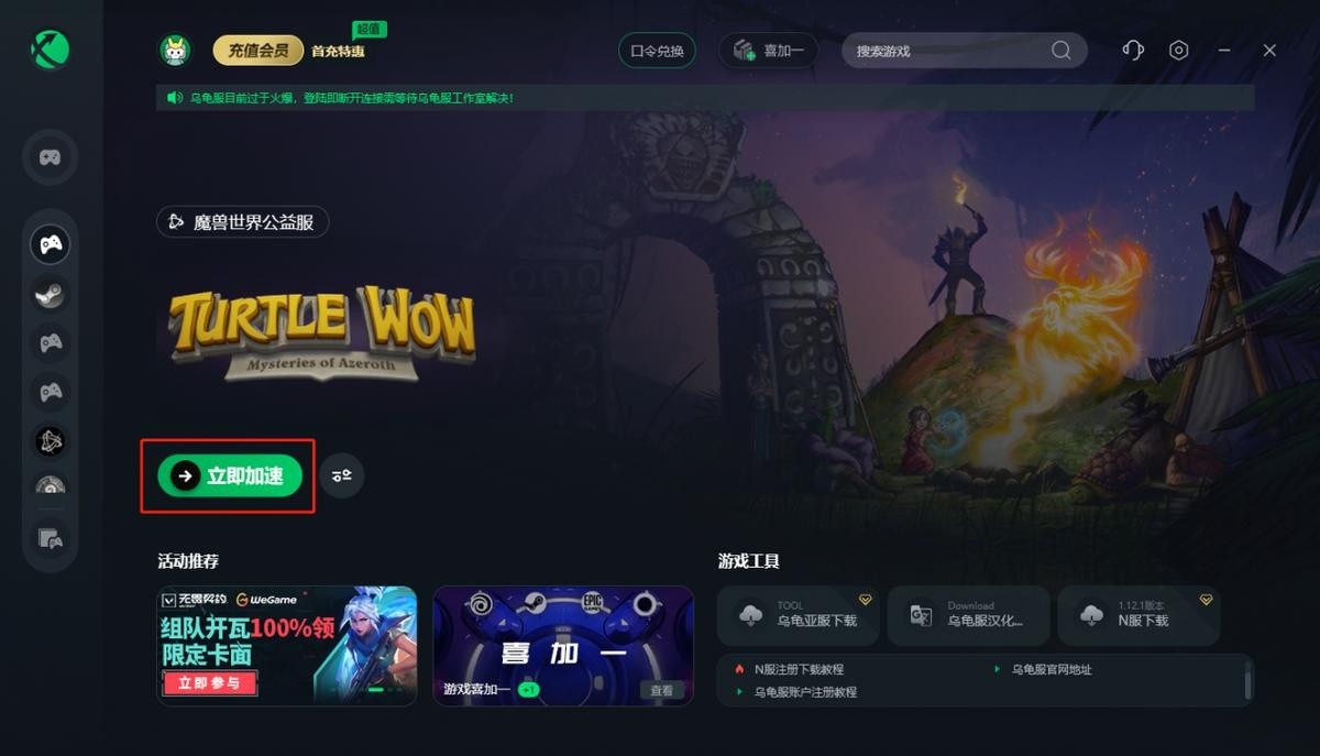 - 便捷下载方式:在迅游《魔兽世界》公益服页面的“游戏工具”中,找到“乌龟亚服下载”按钮点击,等待下载完成并安装。