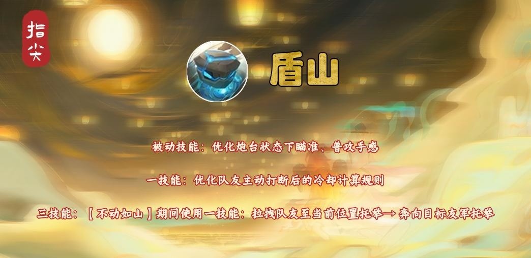 盾山在体验服中进行了大幅度的优化或重做,优化了炮台下的瞄准和普攻手感,使得使用体验更加流畅,大招期间使用一技能可以把队友拉到身边托举,变成了更为合理的扑向队友后托举,避免了影响队友的视角和使用位移技能导致的问题。