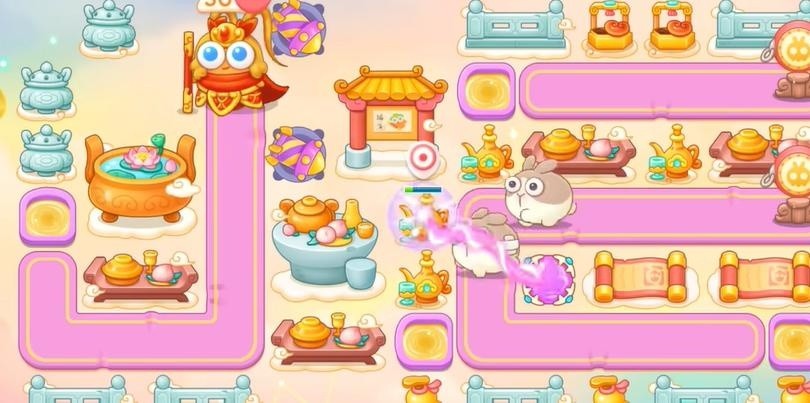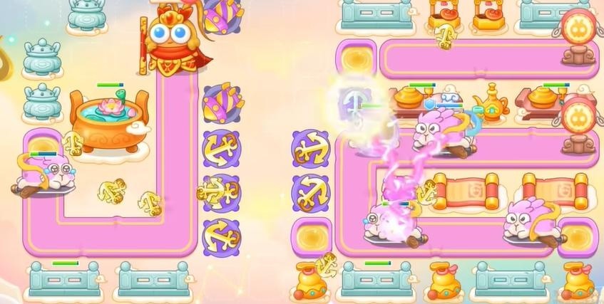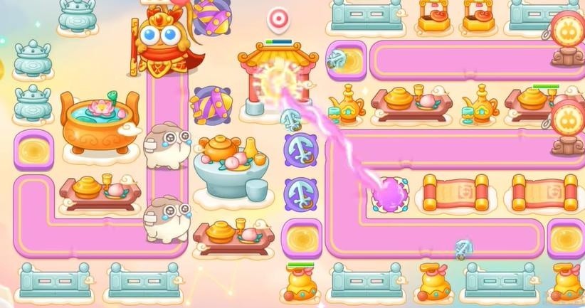 建立二级导弹和魔法球,优先攻击下方的香炉和兔子,随着游戏的进行,不断赚取金币,为导弹和魔法球升级。