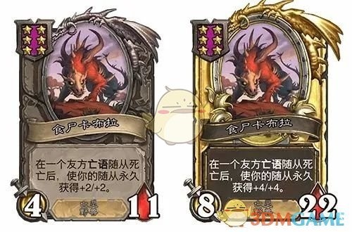 原先的食尸卡布拉描述为:[4/13] 在一个友方亡语随从死亡后,使你的随从永久获得+2/+1的效果,而在最新的31.2.2补丁中,其描述已经调整为:[4/11] 在一个友方亡语随从死亡后,使你的随从永久获得+2/+2的效果。