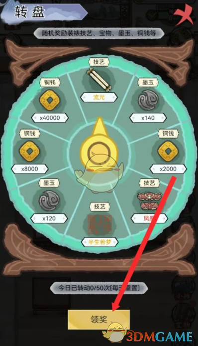 - 在转盘抽奖页面,点击领奖按钮,每日最多可领取50次,凭借你的运气,或许在多次尝试后就能获得神秘的财神爷宝物。