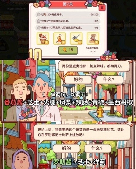 餐点制作:准备番茄酱、芝士、凤梨、火腿、辣肠、青椒及墨西哥椒等食材,按照游戏内指示制作两份夏威夷披萨,并在其上切两刀,以满足顾客的辣味需求。