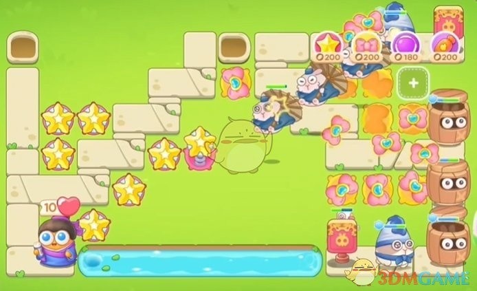 - 右侧继续增加蝴蝶结,同时在左侧多放几个星星以提升伤害输出,根据怪物的移动速度和攻击力,合理调整炮塔的位置和类型。